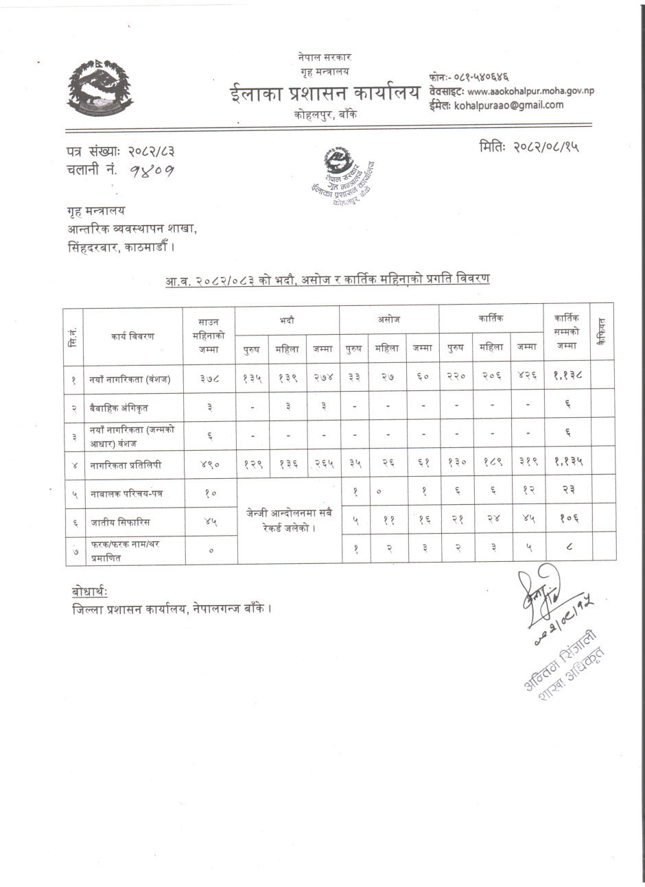 आ.व. २०८२/८३ को भदौँ, असोज र कार्तिक महिनाको प्रगती विवरण