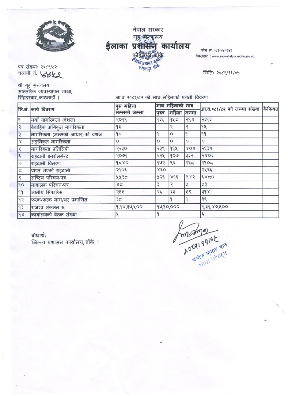 आ.व. २०८२/०८२ को माघ महिनाको प्रगति विवरण