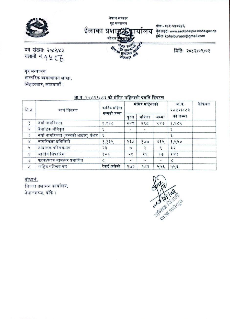 आ.व. २०८२/८३ को भदौँ, असोज र कार्तिक महिनाको प्रगती विवरण