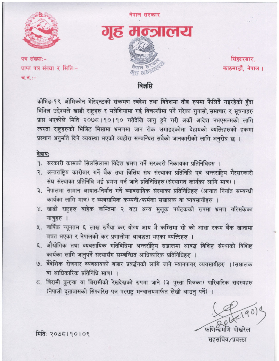 गृह मन्त्रालयकाे मिति २०७८।१०।०९ गतेकाे विज्ञप्ति