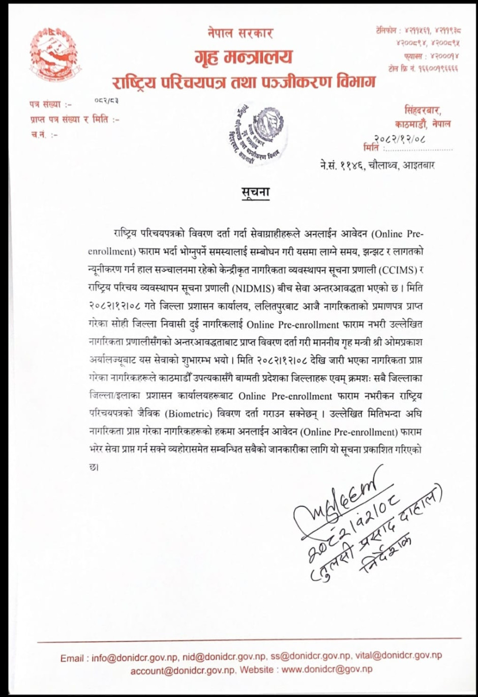 राष्ट्रिय परिचयपत्र सम्बन्धि सूचना ।